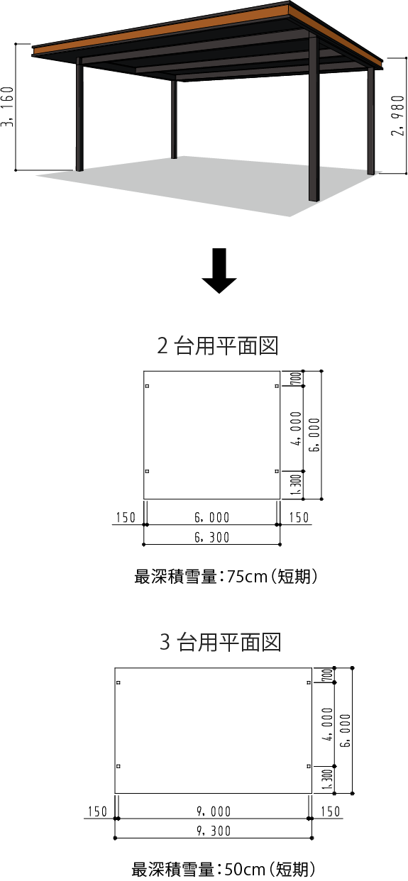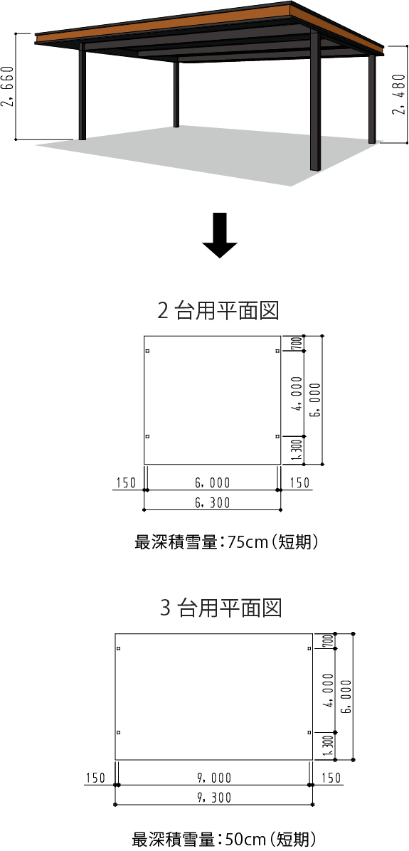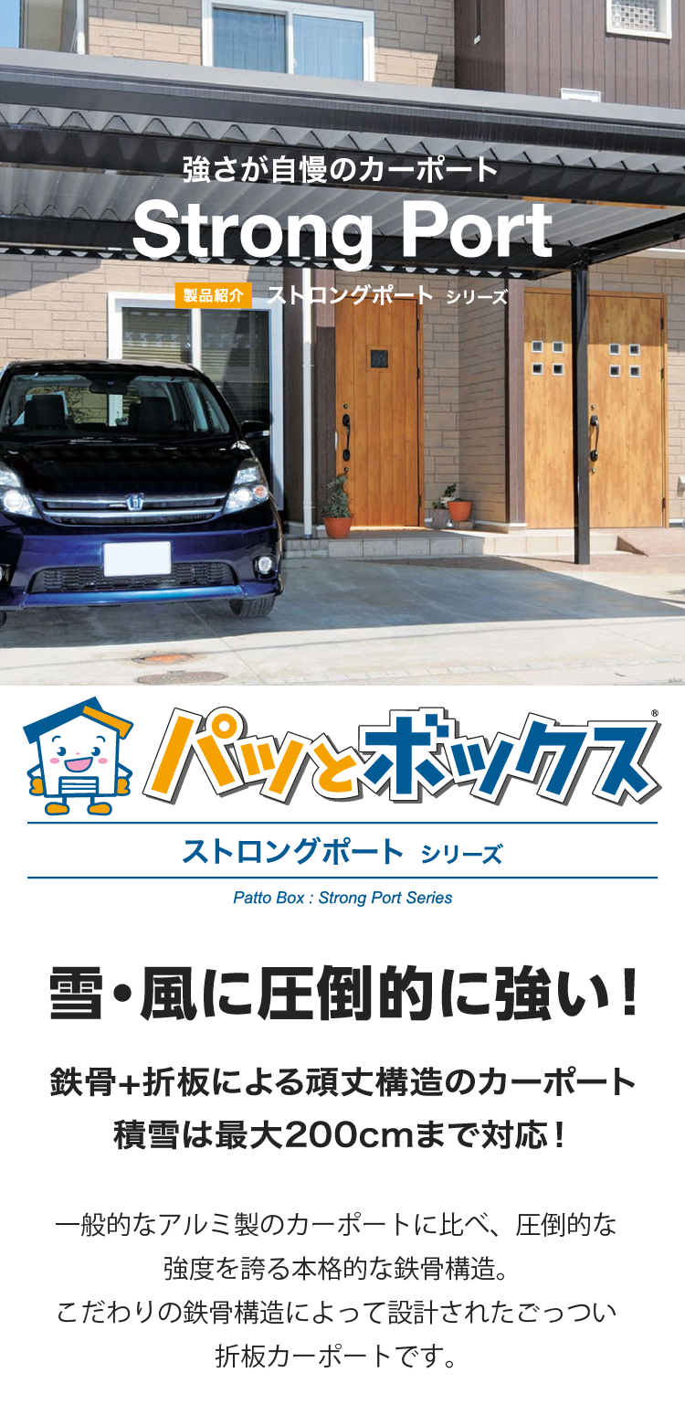 最深積雪量200cm(長期)に対応する鉄骨構造。積雪地域にお住まいの方にもご利用いただくために、積雪100cm、150cm、200cmのラインナップをそろえています。